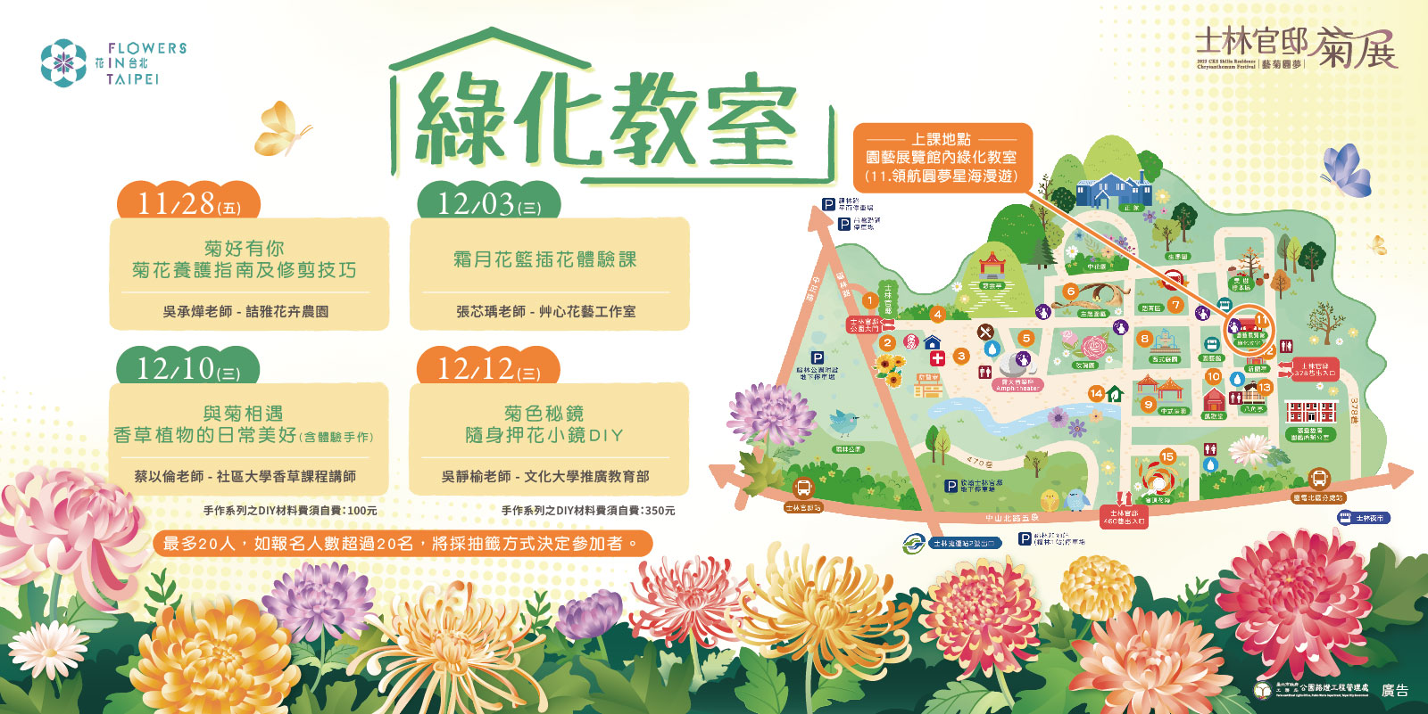 報名方式:填寫線上報名系統(報名連結)。開放報名時間:11月28日上午9點。上課時間:12月12日(五)下午2點。課程名額:限額20位,如報名人數超過20位時,將以抽籤方式決定上課名單,最終上課名單將公告於士林官邸旅客FB(FB粉專連結),費用:本堂課程須繳交課程材料費350元,現場繳費予講師,請自備百鈔及零錢。材料將依講師現場提供為準。