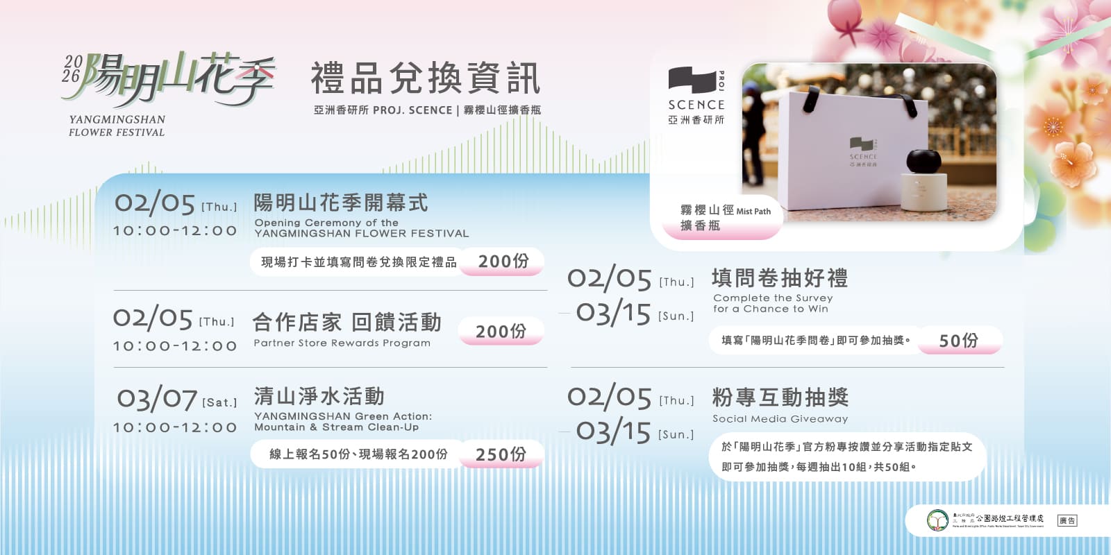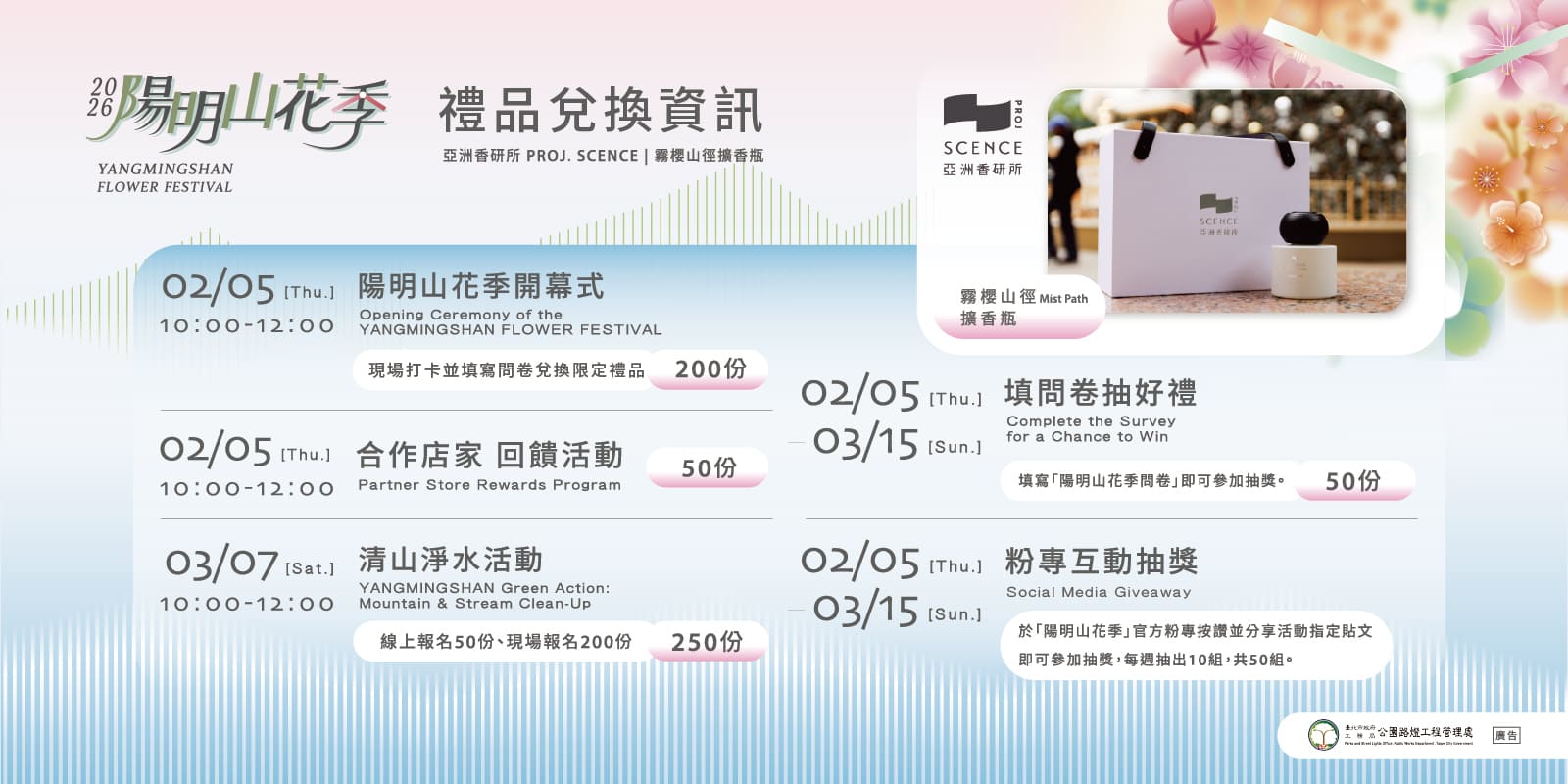 兌換方式|追蹤「陽明山花季」官方臉書粉專,按讚並分享活動指定貼文,依照貼文步驟完成留言,即可參加抽獎,每週抽出10組,共50組。