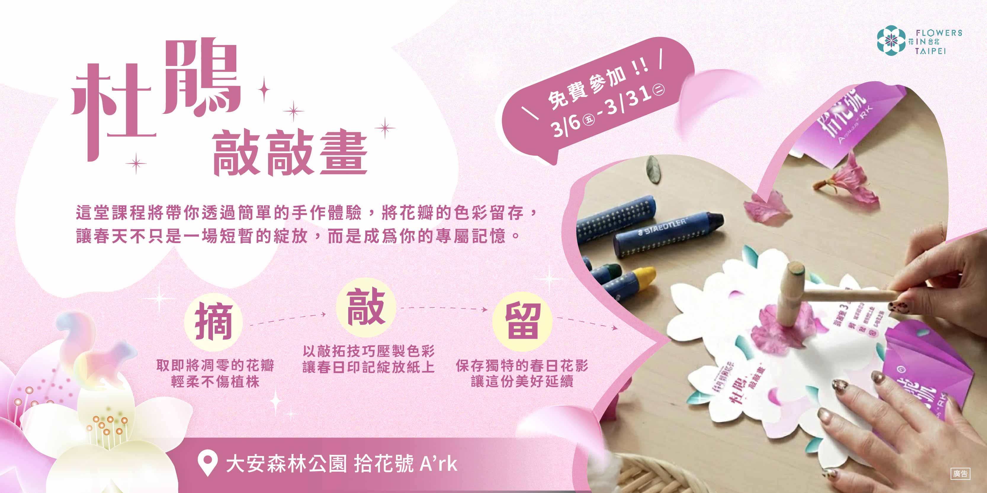 地點:大安森林公園 拾花號 (地圖)費用:免費體驗,現場報名參與※活動即將開始,相關活動連結請留意主辦單位公告※主辦單位保有修改、暫停、及終止活動等權利,依實際執行為主。