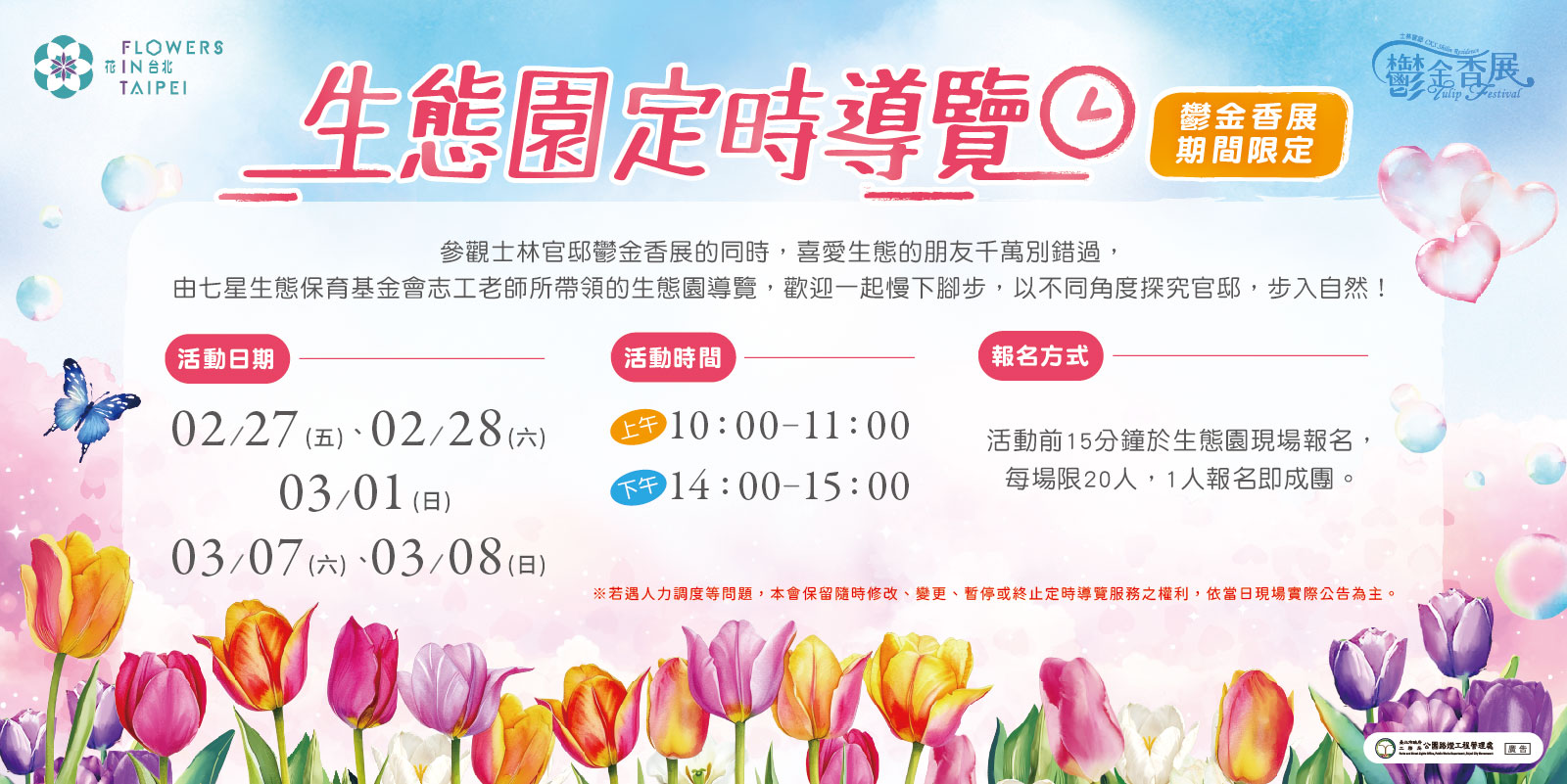 報名方式:活動前15分鐘於生態園入口現場報名,每場最多20人,1人報名即成行
