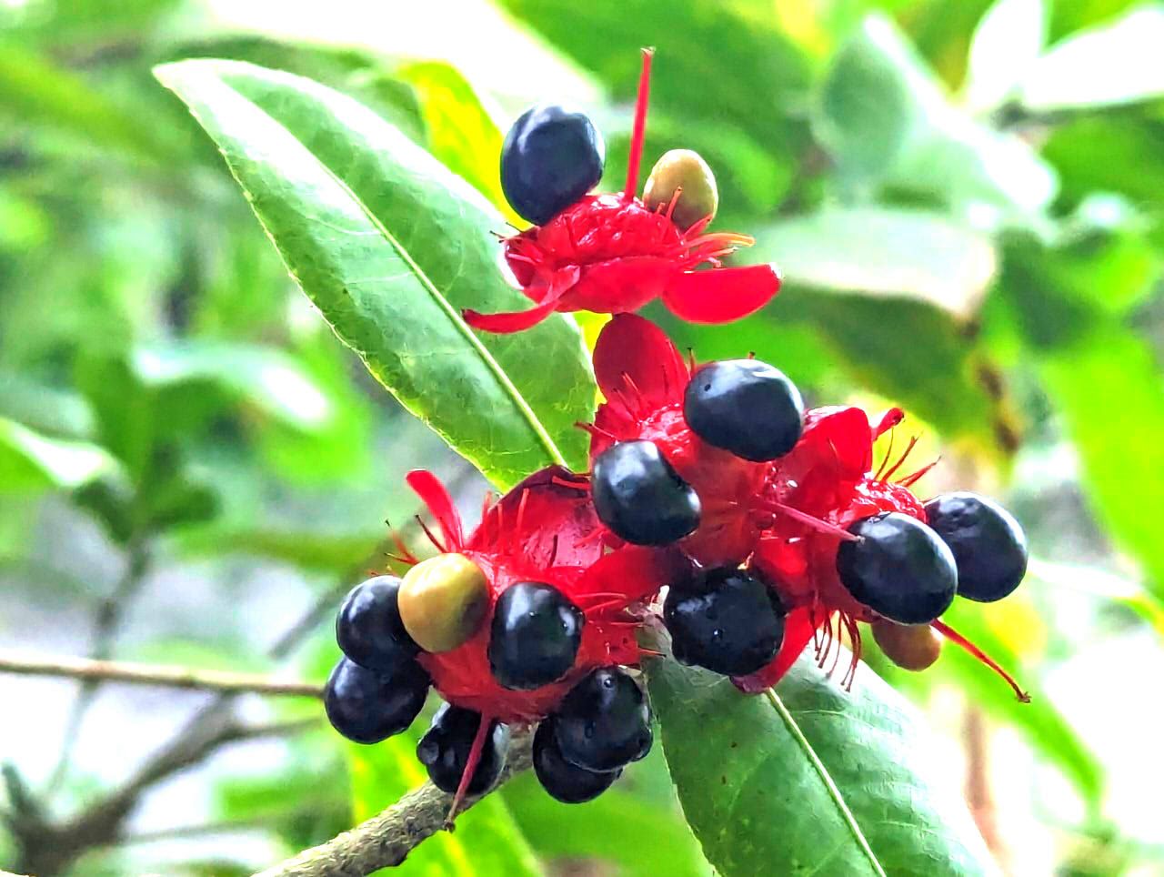 圖7米老鼠樹豔紅色花萼與胎座襯托黑色果實,可以引誘鳥類取食。