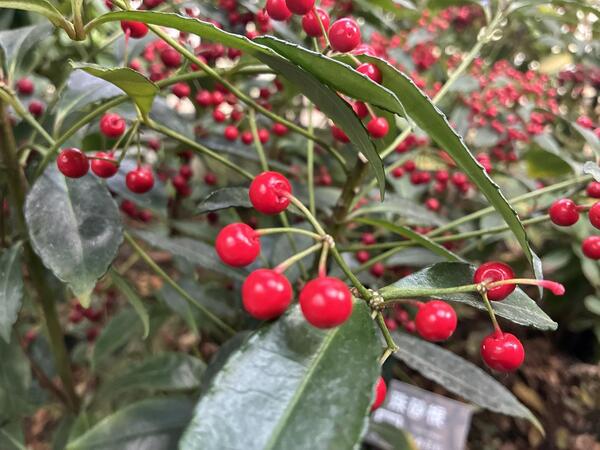 「硃砂根」名稱源自其藥用根部,根皮上帶有紅色硃砂斑點,屬常綠灌木,夏季開花,花謝後將隨即結出紅色圓果,果期冬季延續至春季。農曆春節期間,紅色系植物象徵富貴與喜氣「萬兩」的名稱取自日本園藝界分類方式,果實數量較少、植株矮小的紫金牛稱為「十兩」,果實稍多的百兩金稱為「百兩」,而紅果金粟蘭則被稱為「千兩」,因此果實繁多、色澤鮮紅的硃砂根,自然成為象徵富足的「萬兩」。硃砂根耐陰性強,廣泛用於中、日式傳統庭園或陰暗的大樓中庭、門廳等地點作為景觀配置用。無論搭配景石、叢植,或作為矮籬,都能為空間增添層次與生氣。