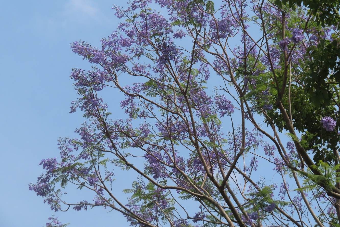 公園處園藝工程隊楊國瑜隊長表示,藍花楹是紫葳科藍花楹屬的植物,同科的著名觀賞花木還有洋紅風鈴木、黃花風鈴木、黃鐘花等,但藍花楹的葉片並非掌狀葉,而是呈現更為纖柔的二回羽狀複葉,宛如藍孔雀那飄逸的尾羽隨風飄盪,所以藍花楹也有個豆科蘇木亞科的異姓兄弟紅花楹,也就是大名鼎鼎的鳳凰木,鳳凰木宣告夏季的來臨與畢業的展翅高飛,藍花楹則是在春末用藍紫色如海洋的花朵及輕拂飄動的羽狀葉,體貼地讓路上的行人一點點適應氣溫的暖熱。浪漫亭綠地內還有栽植大株的樟樹,大家在賞花時還能看到疾速飛行的青帶鳳蝶在樟樹嫩葉上產卵,生動烘托天母的雅緻風景。