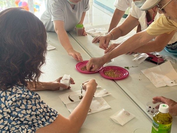 將做好的植物芳香瓶噴在桌上及空氣中,除了消毒也能感受清新的氣味,再將親手製作的茶包注入熱水,看著乾燥的香草在水中舒展、釋放香氣,沉浸在茶樹的清香時並細細品嚐溫熱茶香,感受自然植物帶來的寧靜與放鬆。這不僅是一場茶飲體驗,大家一起動手做,更是與田園香草作物、個人與社區及人群連結的溫暖過程。
