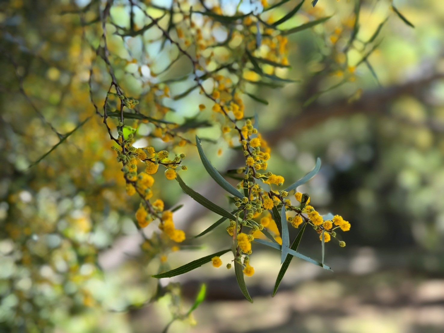 在微風輕拂與晴朗藍天的映襯下,陽明山花卉試驗中心園區步道旁最引人注目的景象,莫過於步道旁盛開的相思樹。隸屬豆科含羞草亞科金合歡屬的相思樹,曾是台灣早期重要的造林樹種,每逢花開,細緻的球形小黃花密集綻放,遠望宛如金色花瀑傾瀉而下,在陽光下閃耀動人。