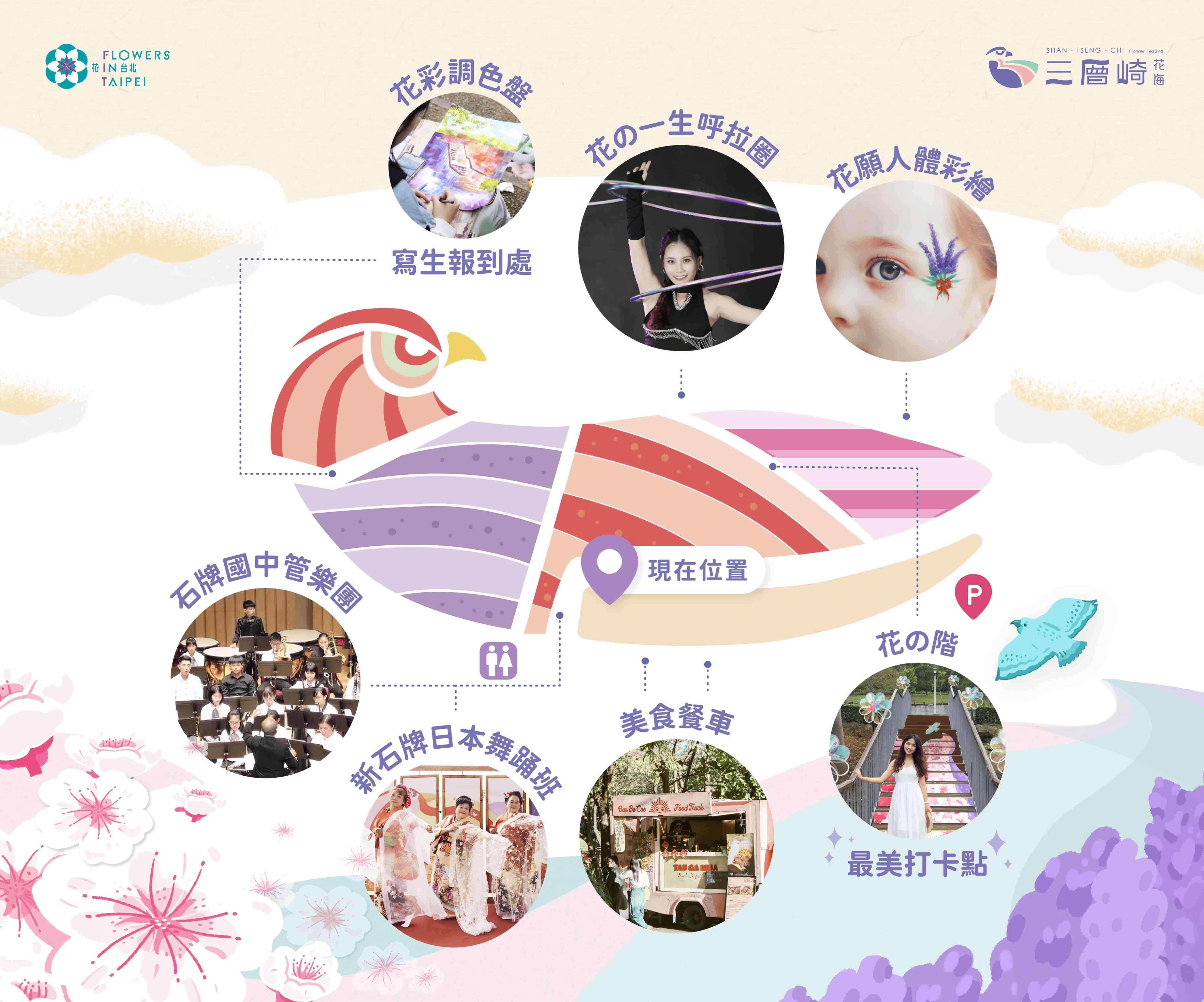 [ 石牌國中管樂團 ]10:30 - 10:4511:00 - 11:1511:30 - 11:45⋯⋯⋯⋯⋯⋯⋯⋯[ 花願人體彩繪 ]11:00 - 14:00⋯⋯⋯⋯⋯⋯⋯⋯[ 花の一生呼拉圈 ]14:00 - 14:3015:00 - 15:30⋯⋯⋯⋯⋯⋯⋯⋯[ 新石牌日本舞踊班 ]13:00 - 13:50
