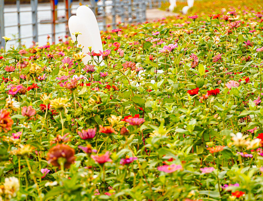 水利處選用近萬盆醉蝶花作為花海的主設計,延續野花園風格,醉蝶花搭配粉、白、紫的天使花,以及粉色金魚草,利用相近顏色而不同高度的植栽,打造層次鮮明的花海美景,粉嫩花叢間以藍紫色的超霸及墨西哥鼠尾草進行點綴,更加凸顯柔美的河岸景緻。
