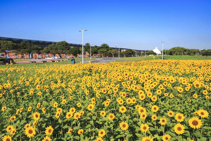 大佳河濱花海區擁有寬廣地貌,廣闊的綠地映襯基隆河畔的遼闊天際,蜿蜒的河岸線與花海相互輝映,已吸引許多民眾駐足欣賞。在夕陽餘暉下,金黃色的向日葵花海與大直橋遙相呼應,是每年必看必拍的絕美景致!