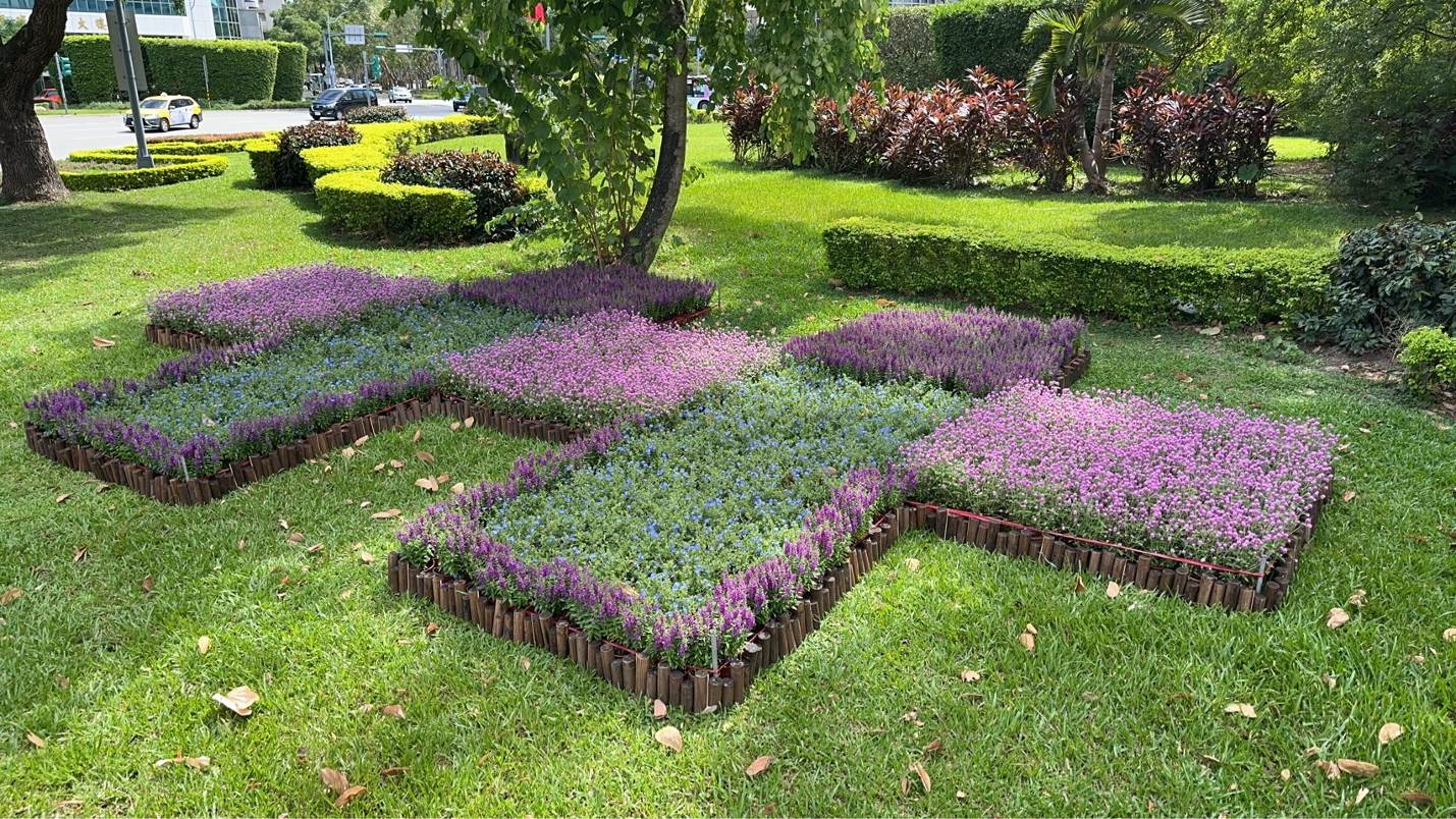 公園處楊國瑜隊長表示,這次仁愛圓環2處繽紛的雙十造景運用1千5百餘盆的草花,有千日紅、藍星花、天使花等種類。這些草花都是出自公園處苗圃同仁自行播種、移盆、培育、施肥、養護等,可說是能人巧手達人的綠手指默默耕耘而來,而造景佈置過程於10月1日由苗圃同仁現地放樣後,在當日趕工1天完成。繽紛草花色彩及歡悅氛圍呈現出對光輝十月的祝福,展期自即日起至10月28日為止。